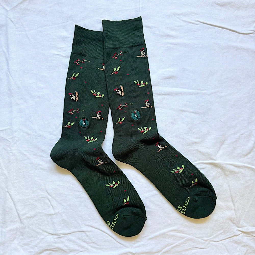 Knock, knock: it’s your new favorite socks! Tap into something good with these forest green woodpecker and berry socks that are perfect for birders, nature lovers, and anyone who isn’t afraid to make a little noise.