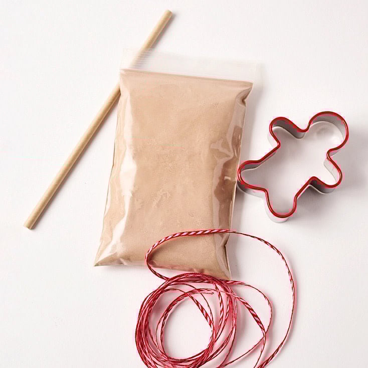 Kit includes:powdered dough mix, a gingerbread cookie cutter, a straw hole punch and ribbon.