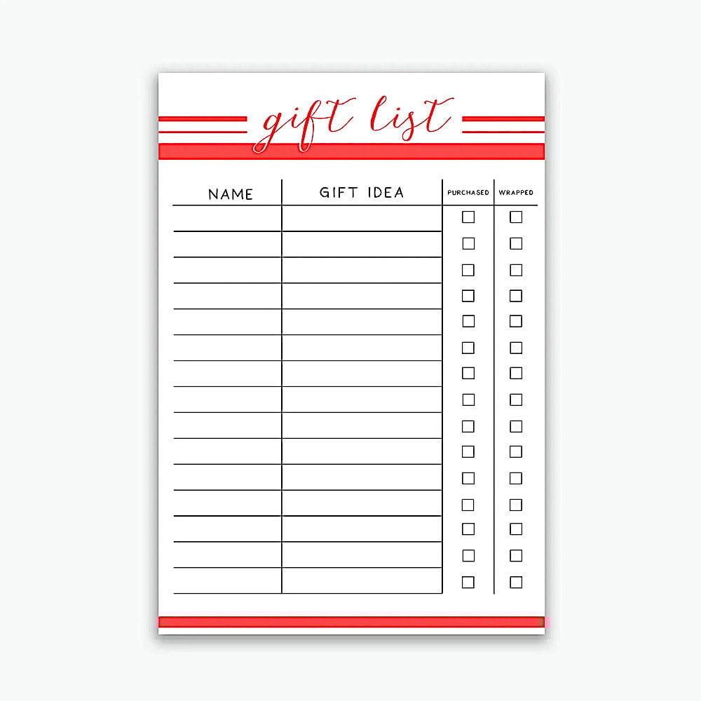 A notepad to keep all your holiday shopping in one place including a column for the people you are shopping for, the idea for the gift and a place to check off if you have purchased the gift plus if it is wrapped and ready to give!