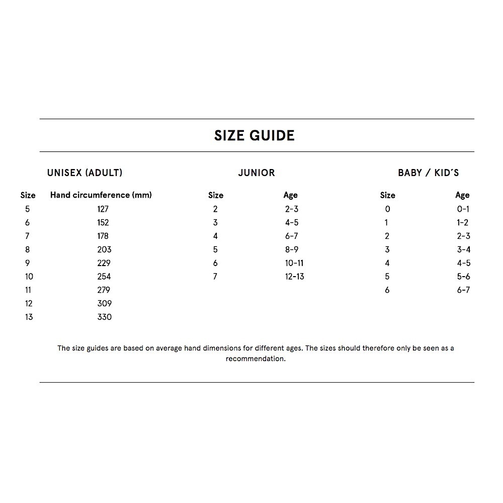 Sizing: Measure the circumference of your hand with a tape measure. If you don't have a tape measure you can use a string which you then measure with a ruler. Compare the measurements with the size guide.