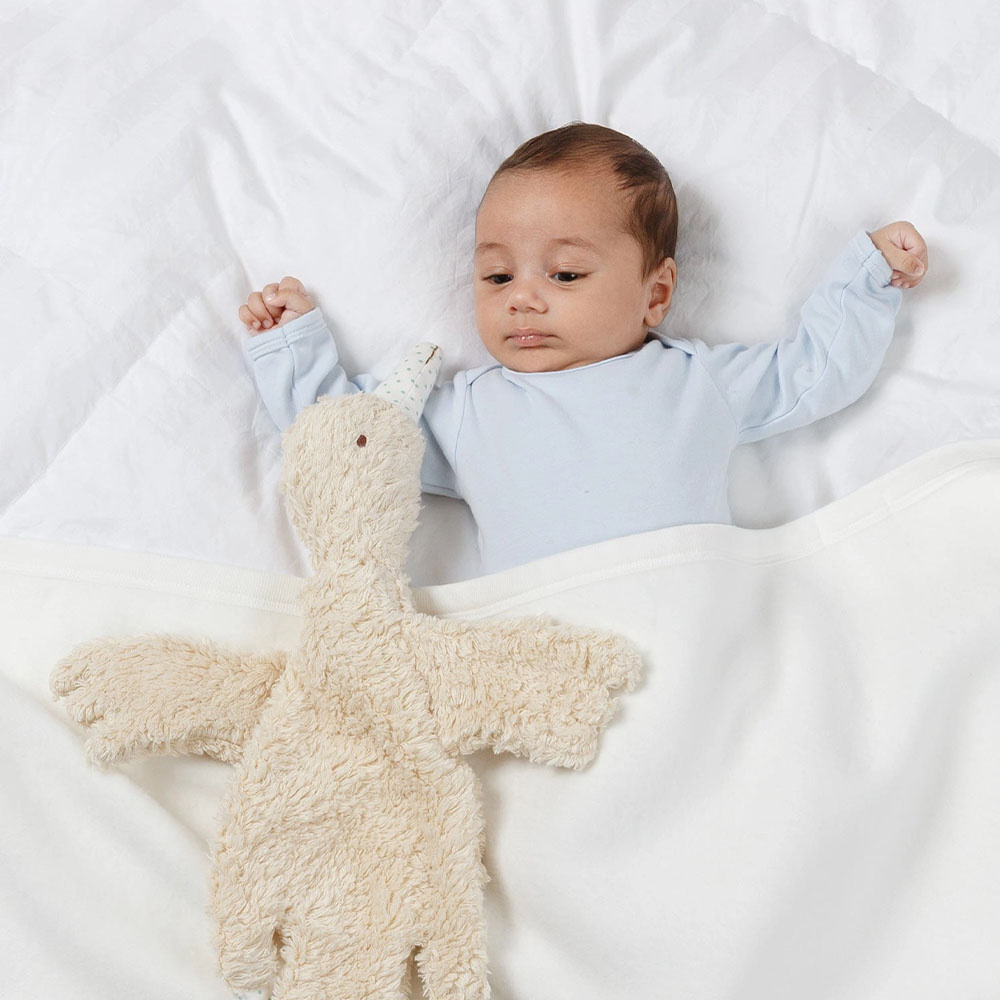 Made for cuddling, the flat sherpa Abigail Goose stuffed animal toy is the perfect friend for your toddler, featuring a "flat" body that is floppy, fun, and easy for little hands to hold. This goose toy is stuffed and made with 100% organic cotton.