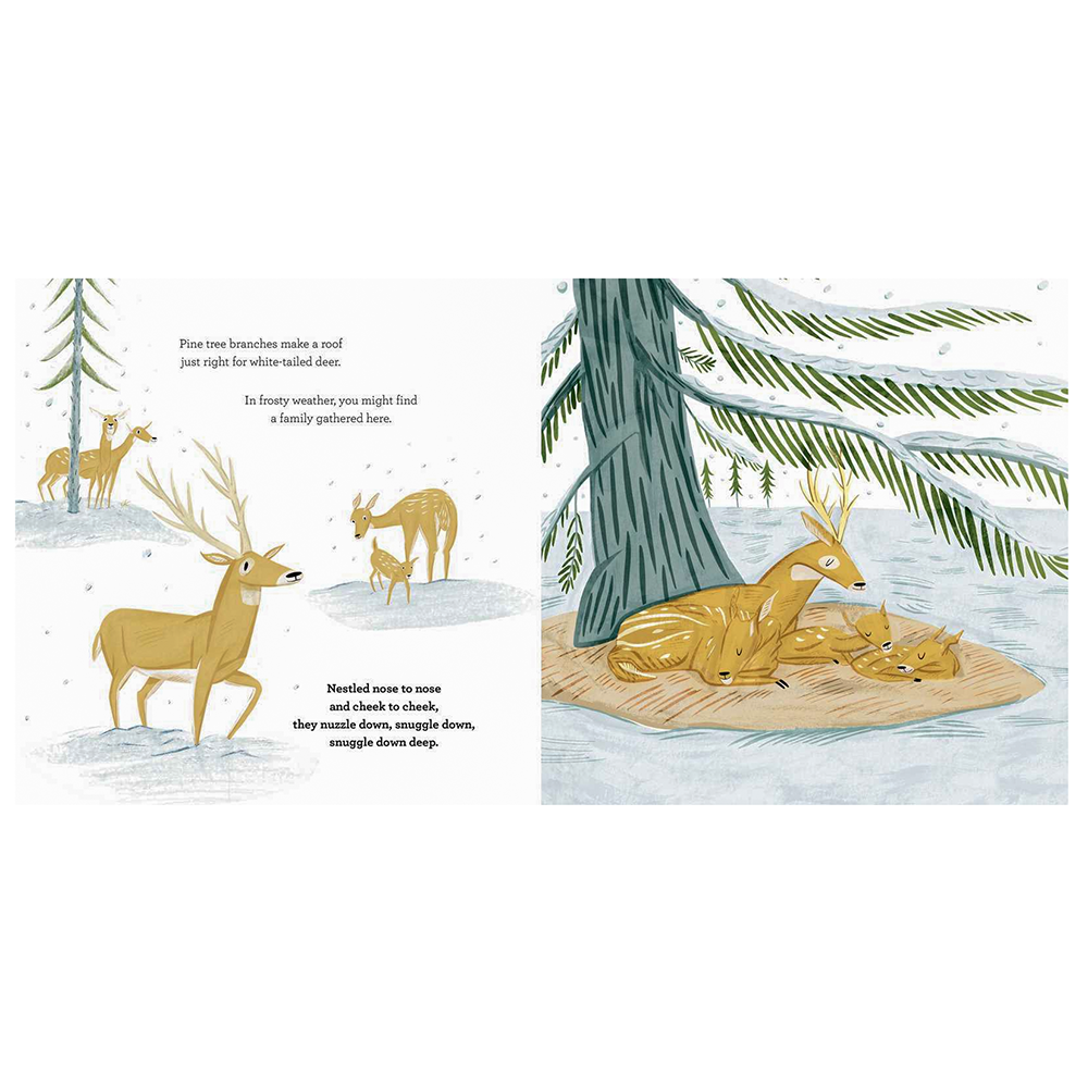 As winter arrives and fluffly snowflakes begin to fall, animal families gather together to snuggle down deep against the cold. They prepare and cozy up their dens, nests, and underground tunnels. Then they curl up nose to nose, cheek to cheek, snuggle down deep, and sleep.