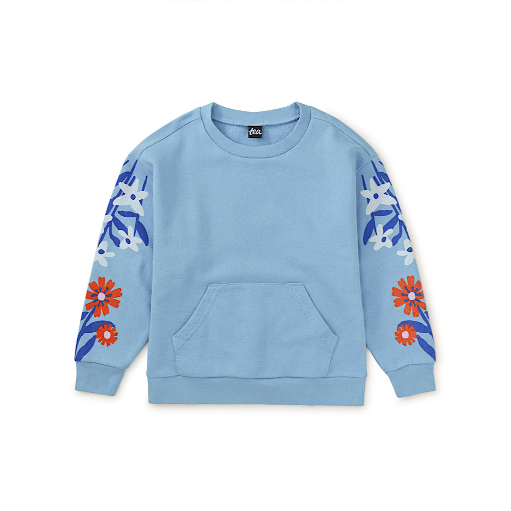 With bold blooms trailing down both sleeves, this cozy pullover brings flower power to cooler days. The roomy kangaroo pocket keeps hands toasty and treasures close, while the 100% cotton French terry ensures softness wash after wash.