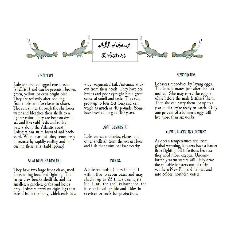After the poem, children can learn fun facts about lobsters, such as what they look like, what they eat, and how they molt. See if you can find the lobster hiding in the eelgrass throughout the book!