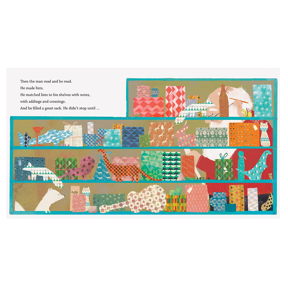 When a hunting fox pounces through the snow and finds itself inside a warm home, it's welcomed and given dinner by a kind bearded man with a big round belly. Soon yawning, the man leaves the fox to explore through piles of strewn wrapping paper and rows of empty shelves. As the man sleeps, the fox curls up, too, until sun and flowers return, luring them both outside. But soon the man gets back to work—drawing and measuring, painting and hammering, sewing and stuffing, until all the empty shelves are filled from top to bottom.