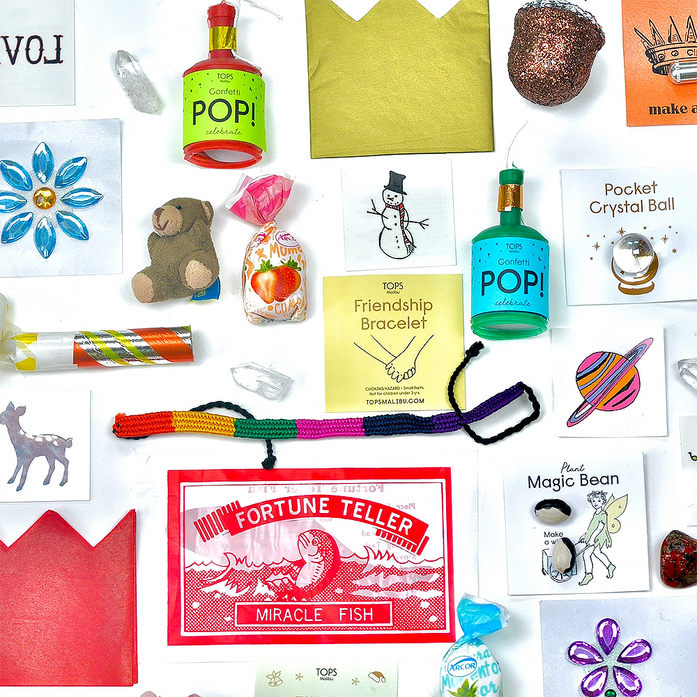 Unwind colorful layers of crepe paper ribbon to reveal many fun treasures inside this festival ball! Surprises include vintage inspired toy, crystal, temporary tattoo, sweet, crown, game and more!